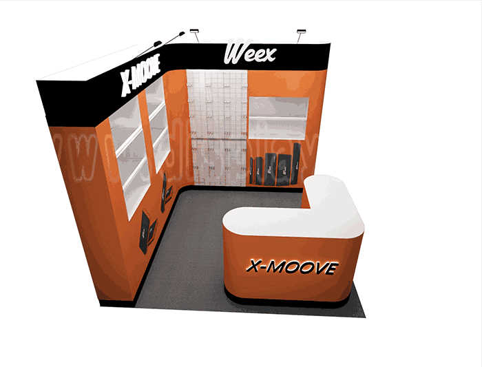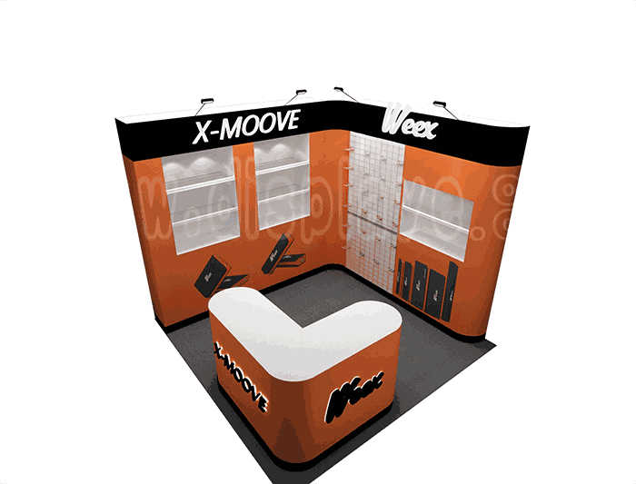 溫馨提示:如你想?yún)⒄者@設(shè)計(jì)圖DIY設(shè)計(jì)構(gòu)思你想要的展臺(tái),此造型結(jié)構(gòu)適用3x3m以下方形展位,你可增加你想要的展示功能或更多的引人注目特裝造型。