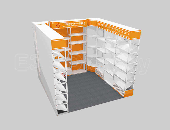 溫馨提示:如你想?yún)⒄者@設(shè)計(jì)圖DIY設(shè)計(jì)構(gòu)思你想要的展臺(tái),此造型結(jié)構(gòu)適用3x3m以下方形展位,你可增加你想要的展示功能或更多的引人注目特裝造型。