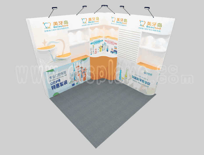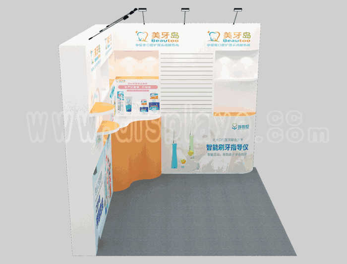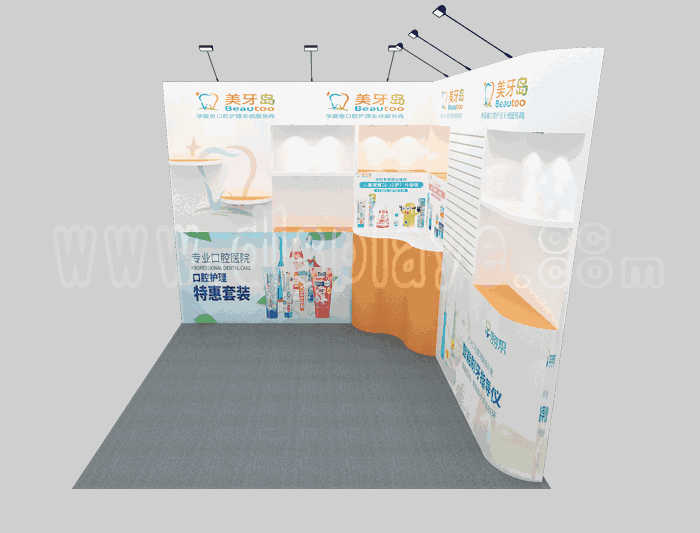 溫馨提示:如你想?yún)⒄者@設(shè)計圖DIY設(shè)計構(gòu)思你想要的展臺,此造型結(jié)構(gòu)適用3x3m以下方形展位,你可增加你想要的展示功能或更多的引人注目特裝造型。