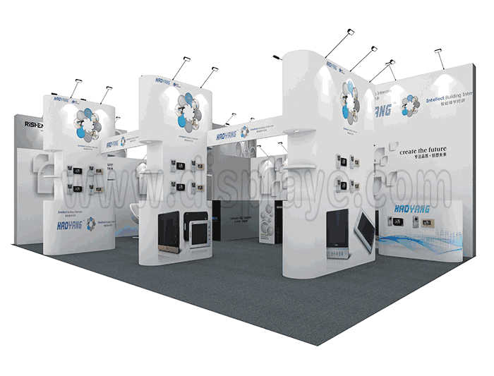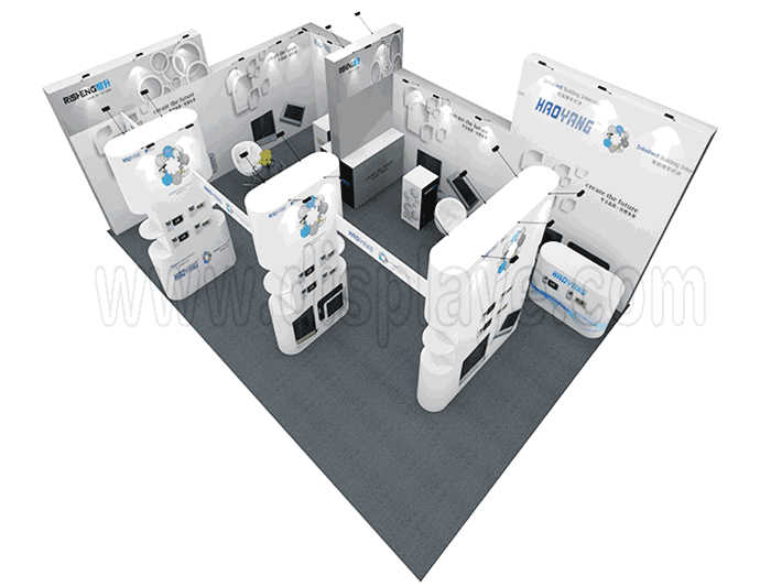 如你想?yún)⒄者@設(shè)計圖DIY設(shè)計構(gòu)思你想要的展臺,此造型結(jié)構(gòu)適用6x9m以下方形展位,你可增加你想要的展示功能或更多的引人注目特裝造型。