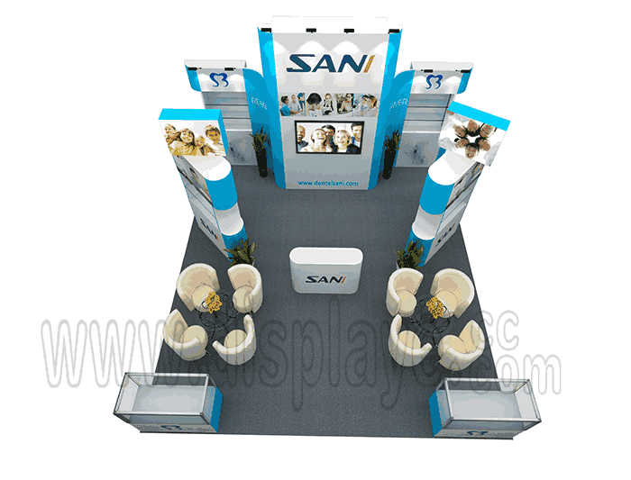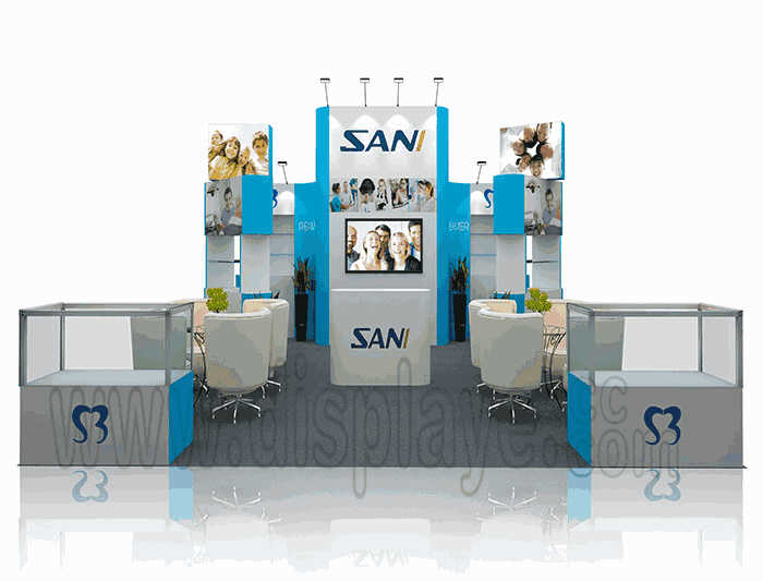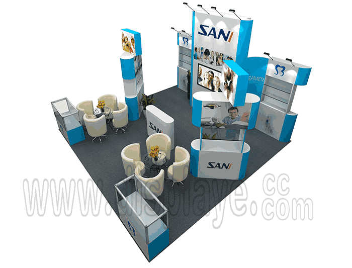 如你想?yún)⒄者@設(shè)計(jì)圖DIY設(shè)計(jì)構(gòu)思你想要的展臺(tái),此造型結(jié)構(gòu)適用6x6m以下方形展位,你可增加你想要的展示功能或更多的引人注目特裝造型。