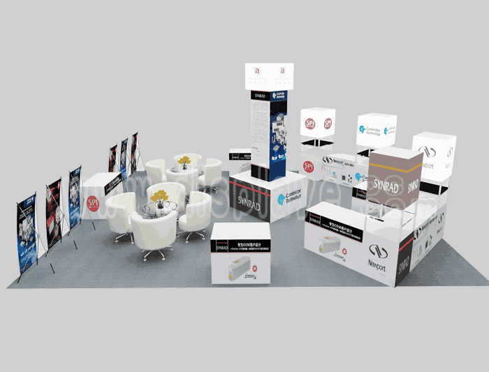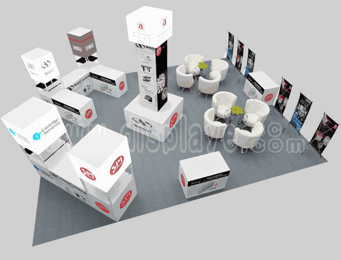 如你想?yún)⒄者@設(shè)計圖DIY設(shè)計構(gòu)思你想要的展臺,此造型結(jié)構(gòu)適用 7x9m以下方形展位,你可增加你想要的展示功能或更多的引人注目特裝造型。