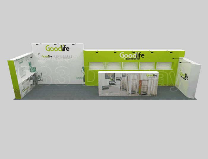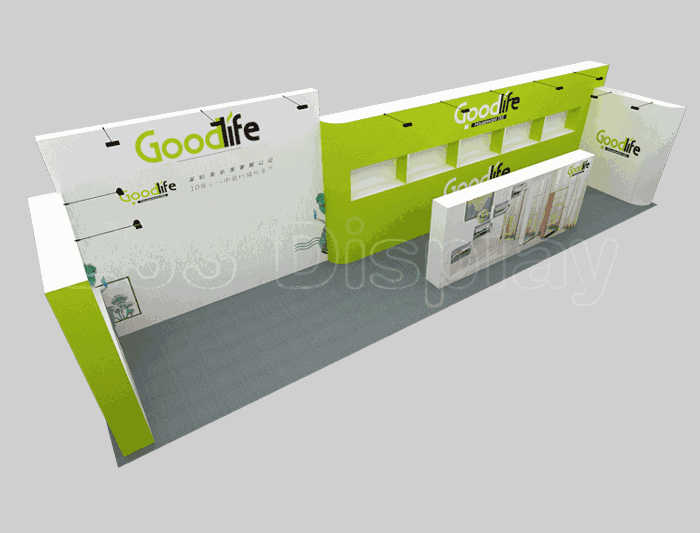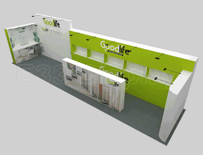 如你想?yún)⒄者@設(shè)計(jì)圖DIY設(shè)計(jì)構(gòu)思你想要的展臺(tái),此造型結(jié)構(gòu)適用 3x9m以下方形展位,你可增加你想要的展示功能或更多的引人注目特裝造型。