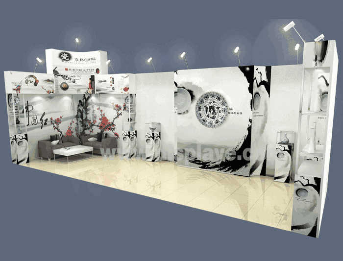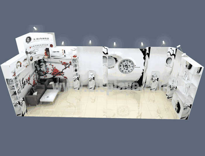 Tips: If you want to DIY design your own stand, this modeling structure applies to 3x9m square booth or below, you can increase more exhibition function or more striking customized modeling.