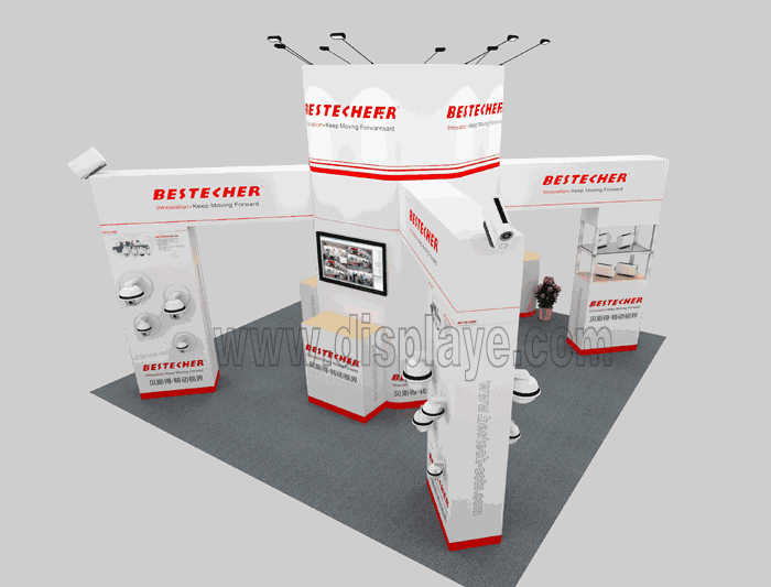 Tips: If you want to DIY design your own stand, this modeling structure applies to 6x6m square booth or below, you can increase more exhibition function or more striking customized modeling.