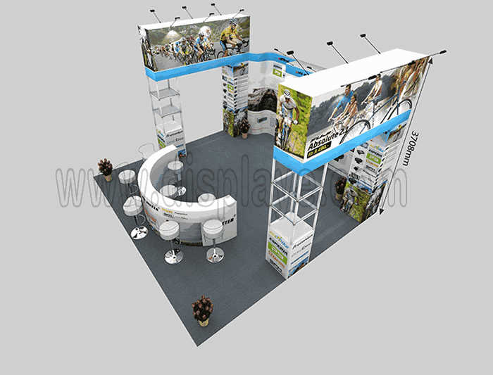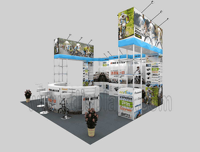 Tips: If you want to DIY design your own stand, this modeling structure applies to 6x6m square booth or below, you can increase more exhibition function or more striking customized modeling.