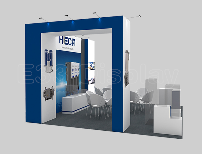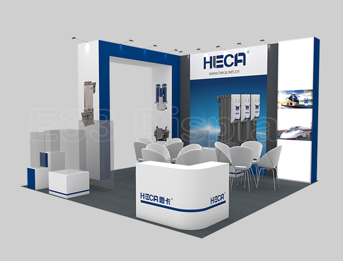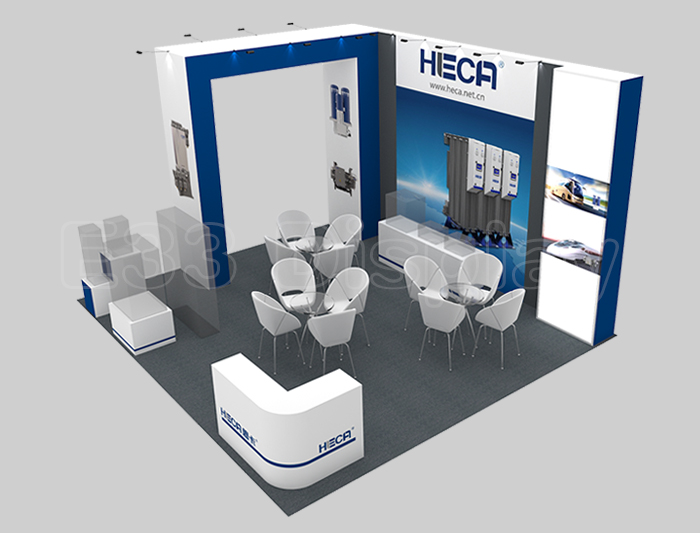 Tips: If you want to DIY design your own stand, this modeling structure applies to 6x6m square booth or below, you can increase more exhibition function or more striking customized modeling.