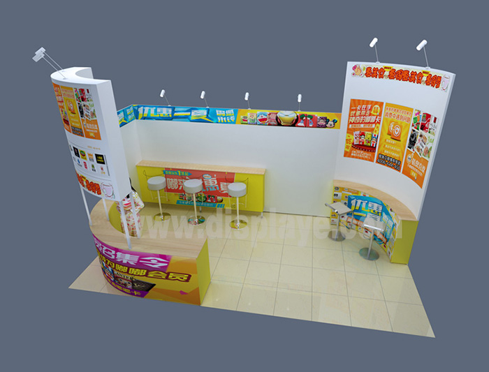 Tips: If you want to DIY design your own stand, this modeling structure applies to 3x6m square booth or below, you can increase more exhibition function or more striking customized modeling.