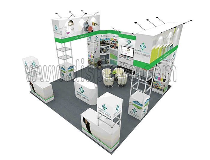 Tips: If you want to DIY design your own stand, this modeling structure applies to 6x6m square booth or below, you can increase more exhibition function or more striking customized modeling.