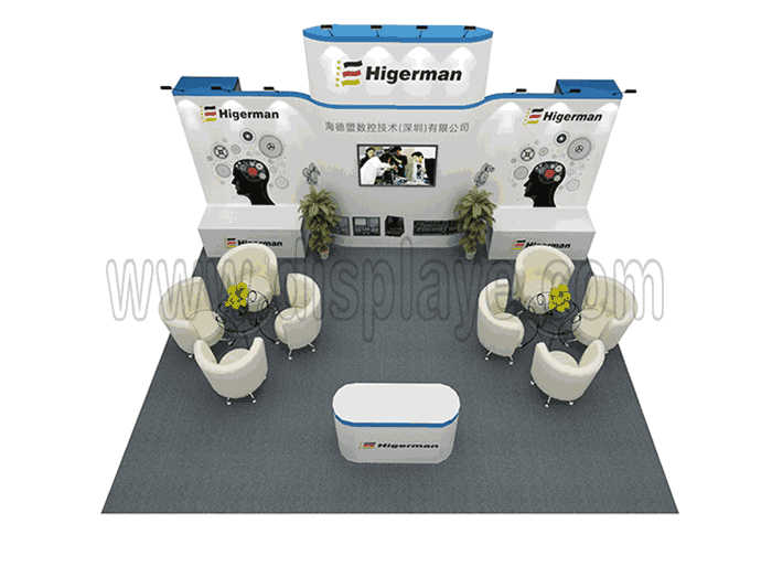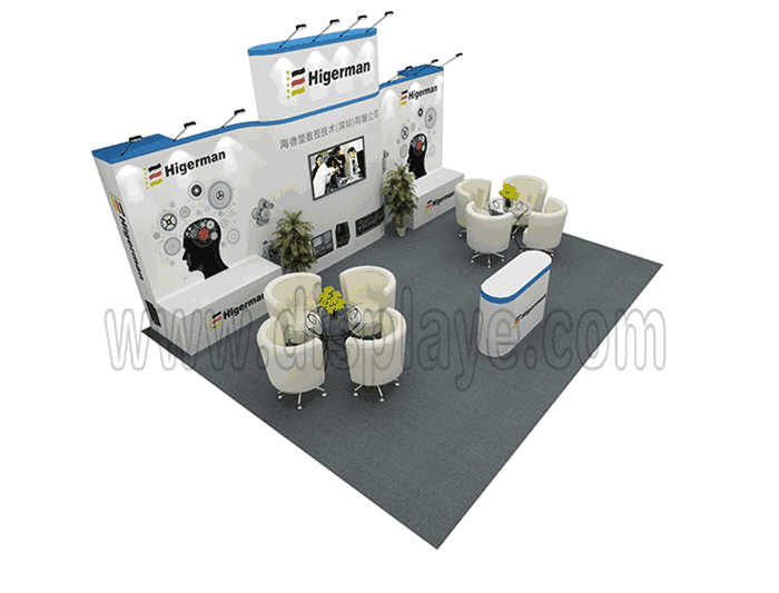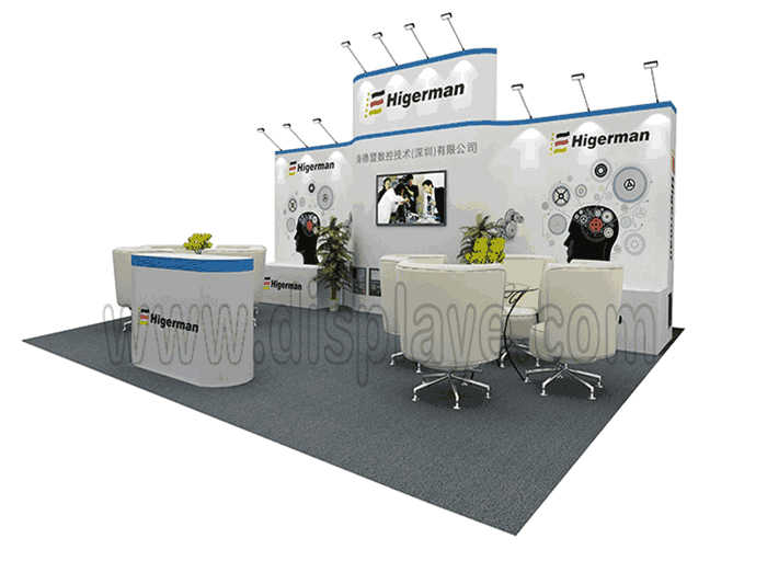 Tips: If you want to DIY design your own stand, this modeling structure applies to 6x6m square booth or below, you can increase more exhibition function or more striking customized modeling.