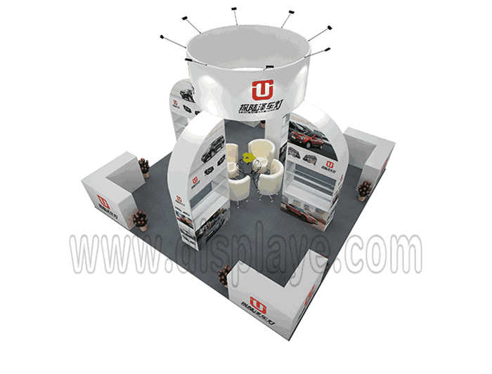 Tips: If you want to DIY design your own stand, this modeling structure applies to 6x6m square booth or below, you can increase more exhibition function or more striking customized modeling.