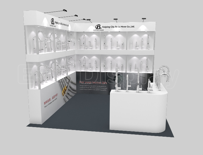 Tips: If you want to DIY design your own stand, this modeling structure applies to 3x3m square booth or below, you can increase more exhibition function or more striking customized modeling.