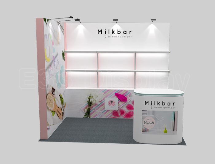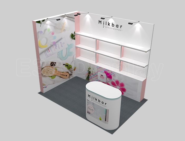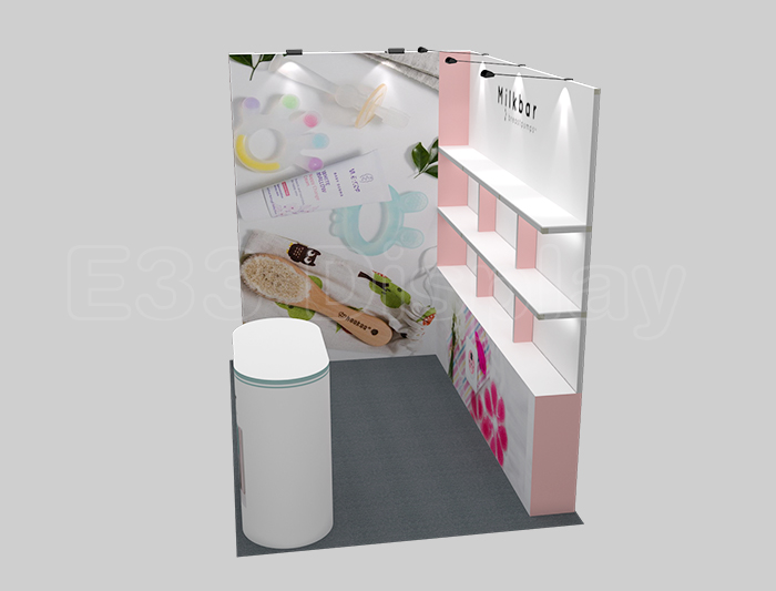 Tips: If you want to DIY design your own stand, this modeling structure applies to 2x3m square booth or below, you can increase more exhibition function or more striking customized modeling.