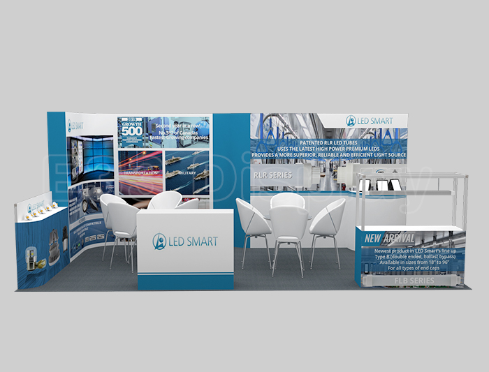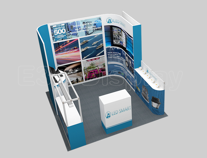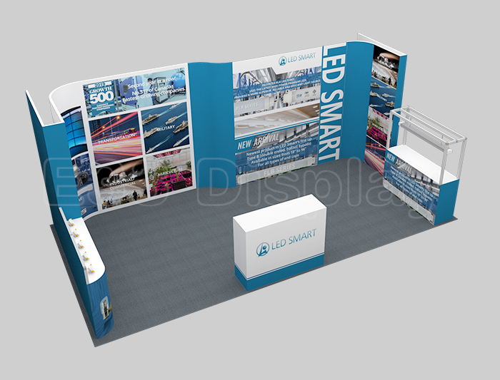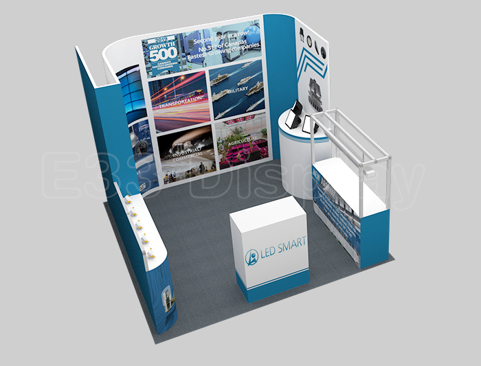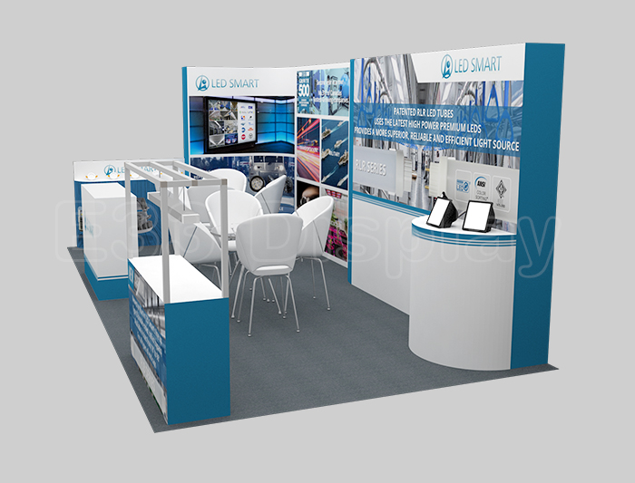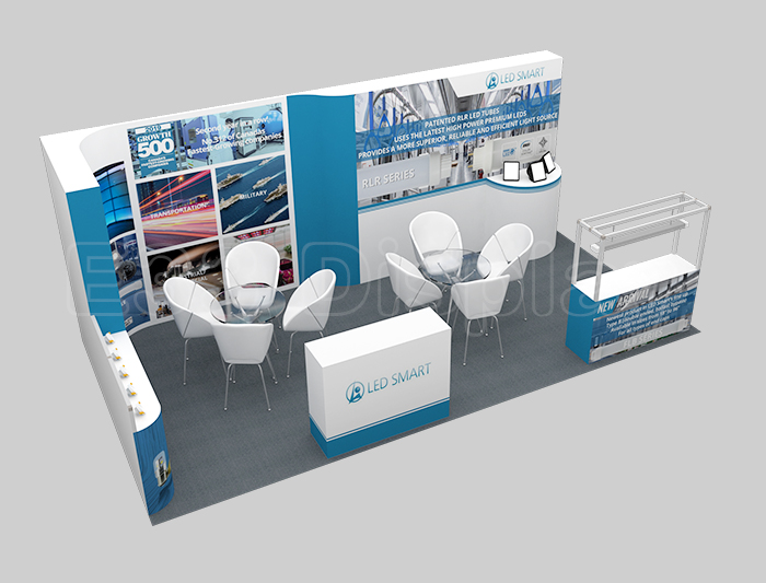 Tips: If you want to DIY design your own stand, this modeling structure applies to 3x6m square booth or below, you can increase more exhibition function or more striking customized modeling.